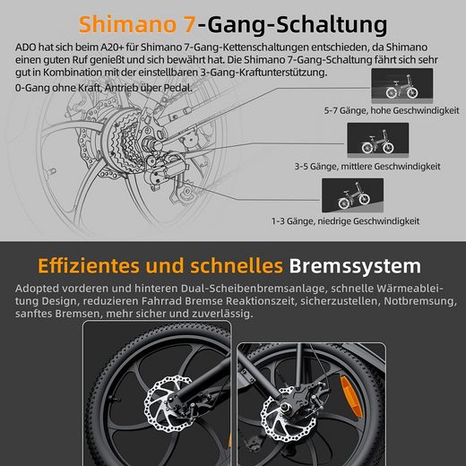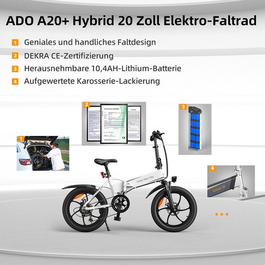 • 250-W-Motor und austauschbarer ADO Cityrad Akku: Elektrofahrrad ist mit einem bürstenlosen 250-W-Motor und einem austauschbaren 36-V-10.4-Ah-Lithium-Ionen-Akku ausgestattet.